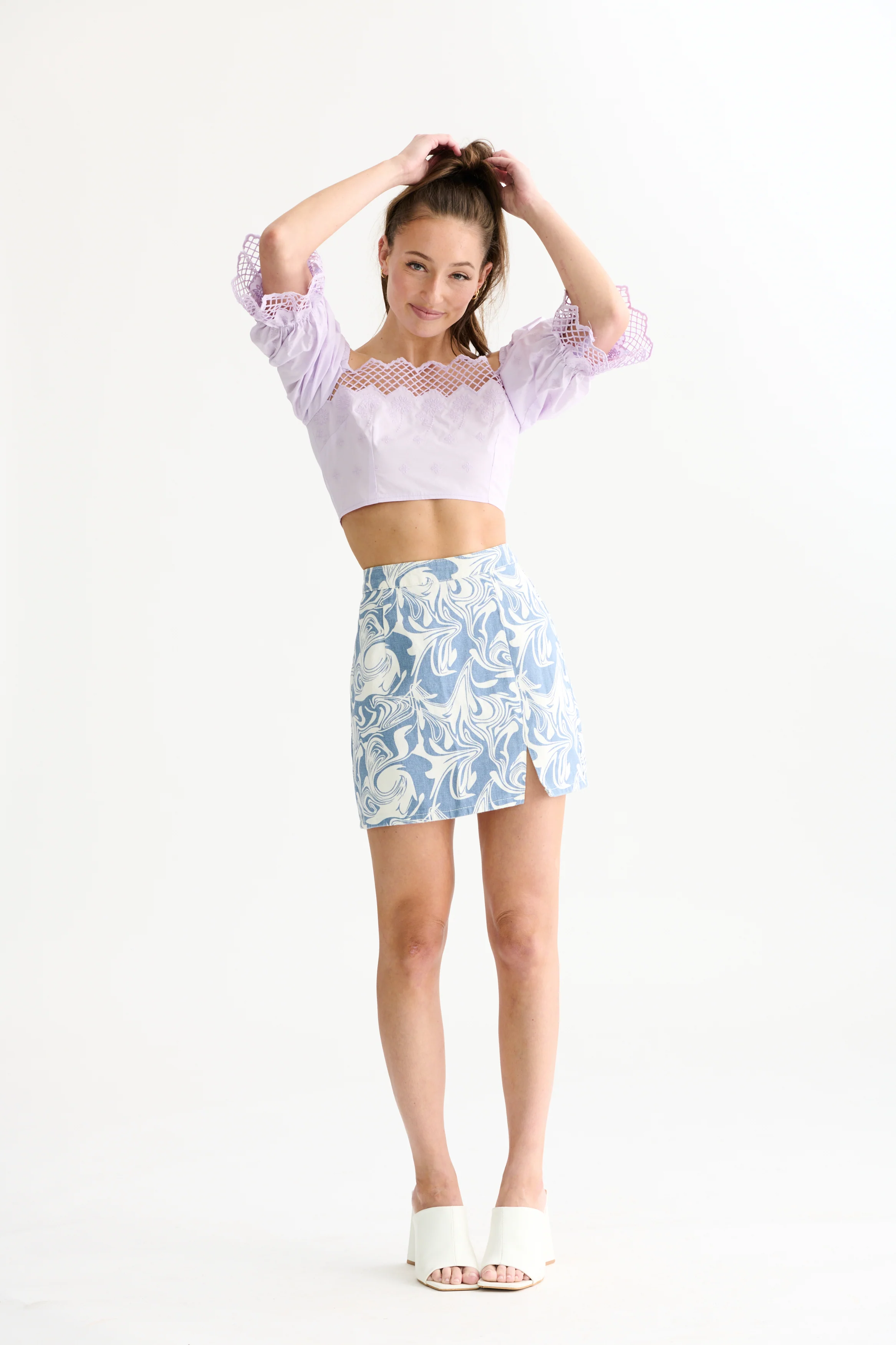 We are obsessed with this unique and dreamy lavender crop top. It features lace details to the neckline and sleeves with floral embroidery to the bodice and elastic puff sleeves. Dress it up with a mini skirt and strappy heels for your next night out.