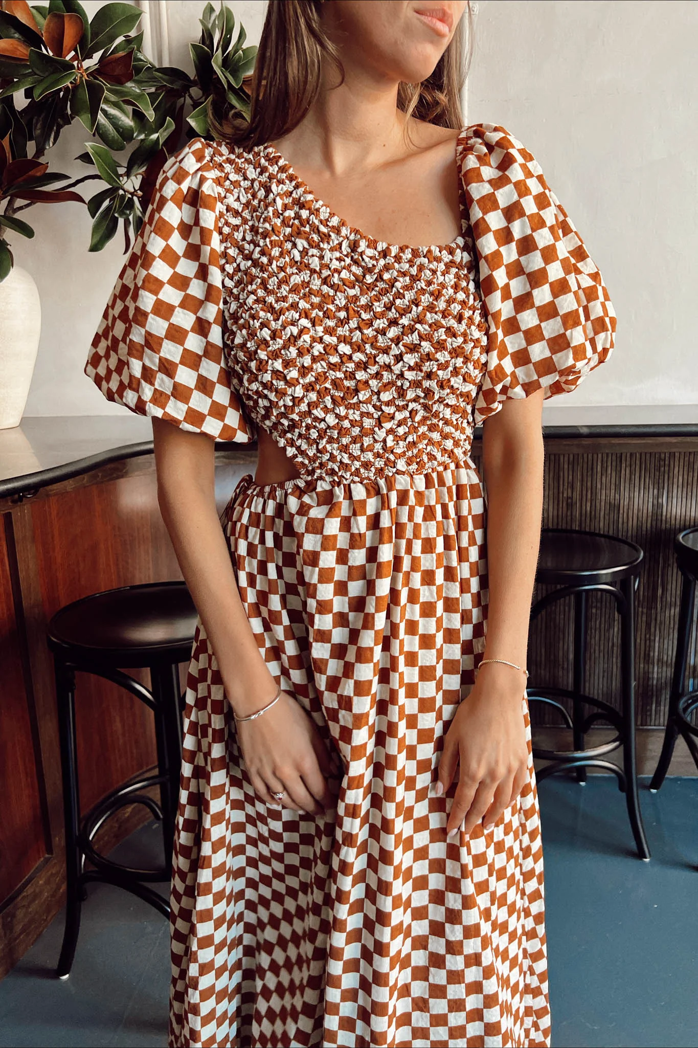 If you're in the market for a designer looking dress at a great price point, this one is for you. We can't get enough of the cream and brown gingham print or of the fun asymmetrical neckline of this one. This maxi length dress has one side cutout, short puff sleeves, and a mega flattering skirt. Pair with sneakers for a casual weekend look or elevate the style further with a pair of heels.