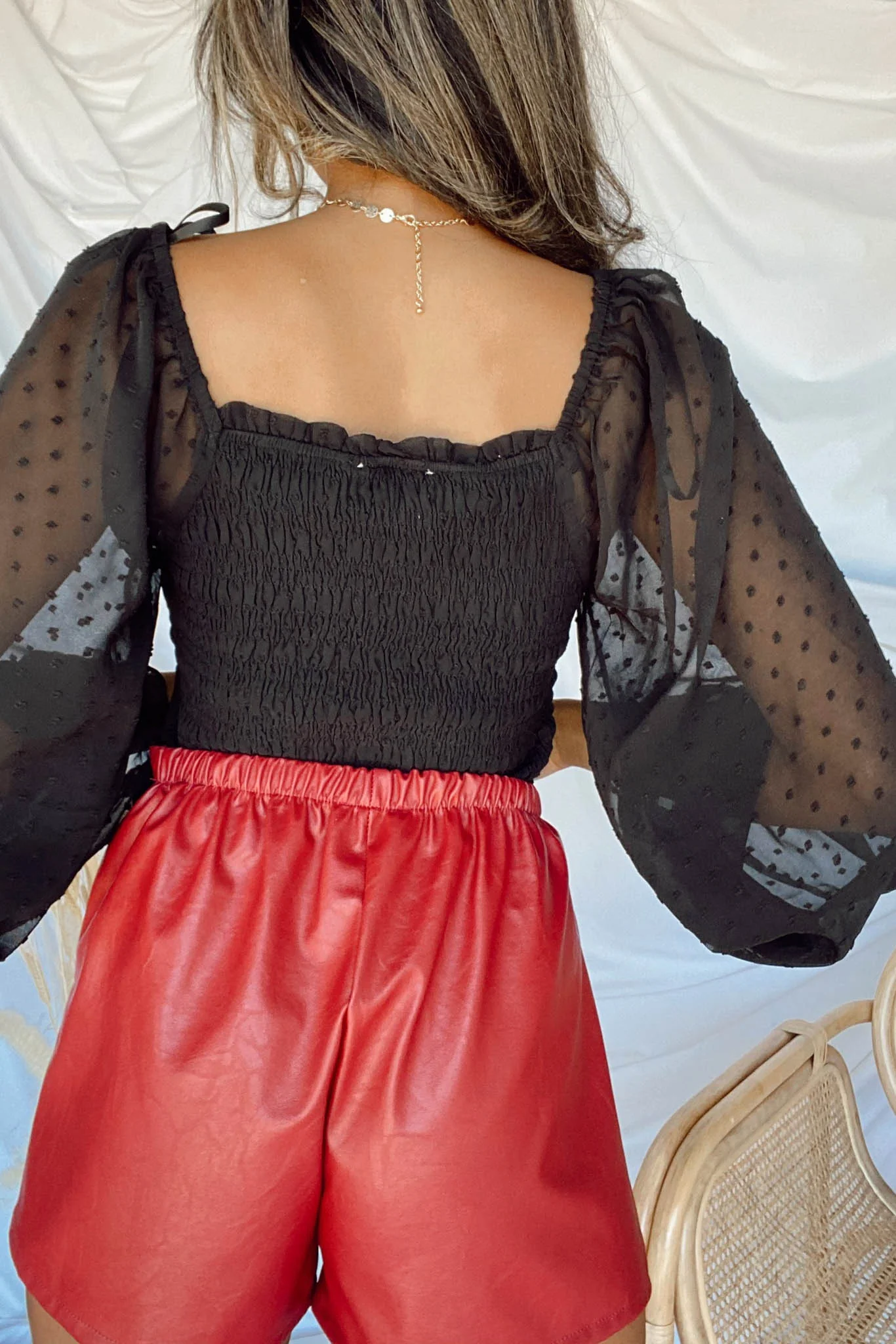 This feminine and flattering cut has become one of our all-time best sellers. The black smocked bodice and sheer sleeves make this top perfect for dressing up for a night out. Fits true to size.