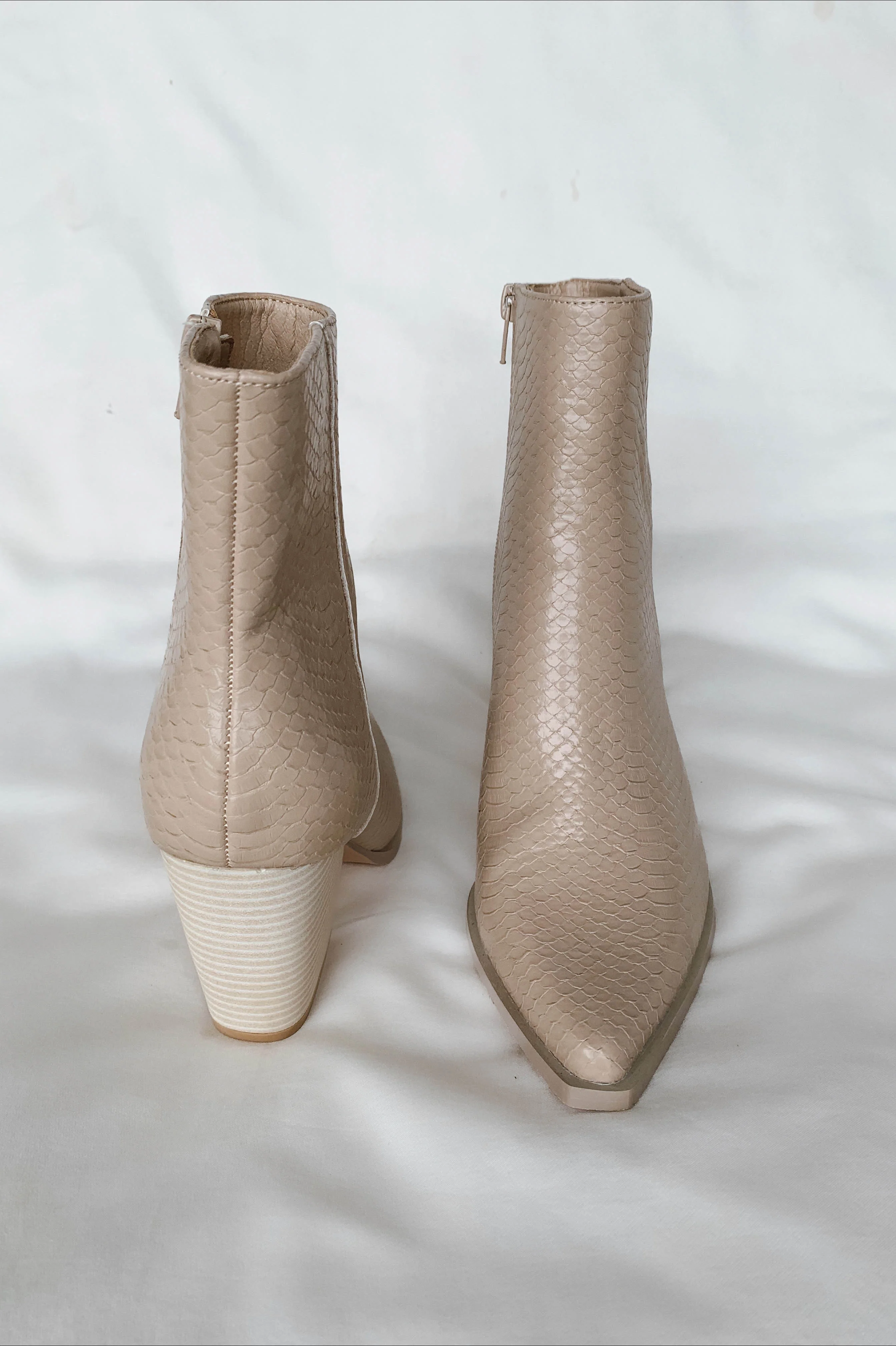 These neutral, beige leather booties are just what you need to get through Fall and Winter. We love the simplistic and classic design. They have pointy toes with block heels and a side zipper. The heel measures 3.5" high. Perfect for both dressing up and casual wear, these will be your newĀ favorite.