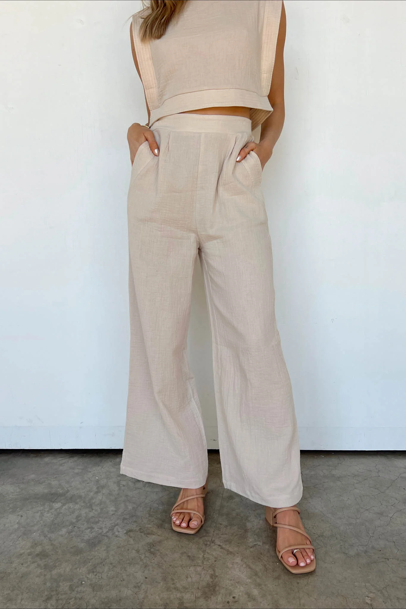 This set goes together just as well as we do, boo. You can wear these pants styled with the perfectly matching 'Two of Us Top' or mix matched with a graphic tee. These are a beige gauze wide leg fit with pockets and an elastic waistband.